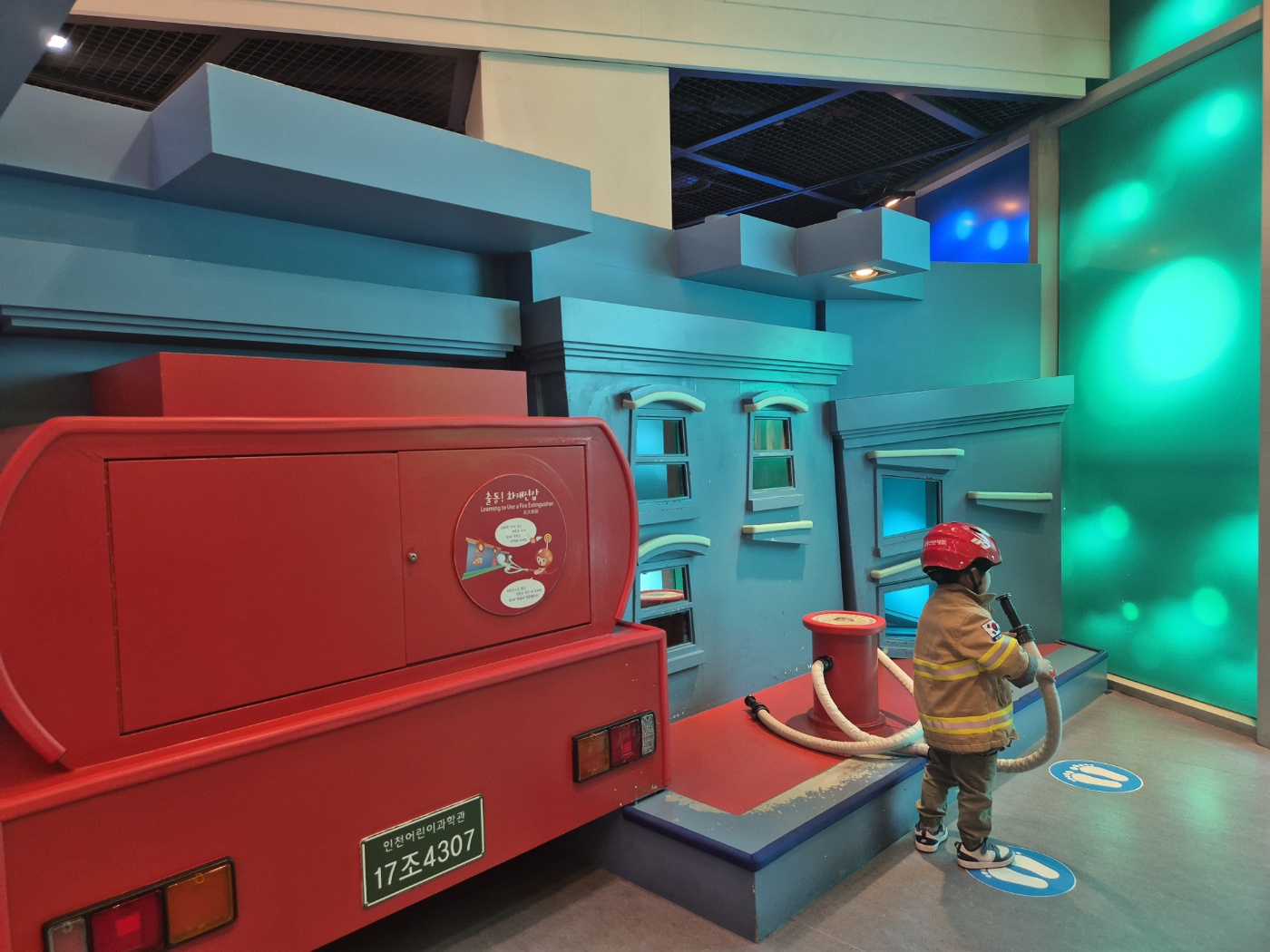 버튼을 누르면 창문에 불 그림이 나타나고, 바람이 나오는 호스를 들고 불을 끄는 체험이었습니다.