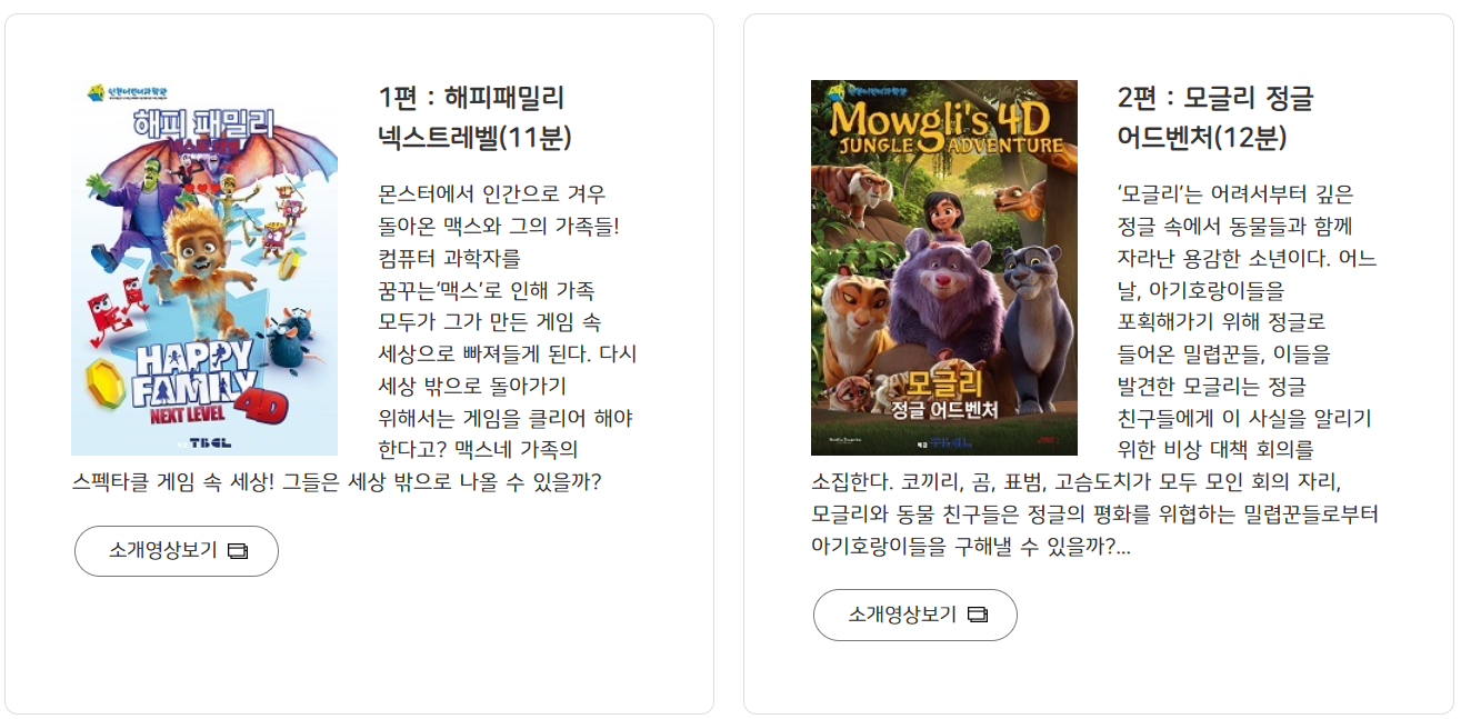 과학관 2층에 있는 4D 영상관에서는 2가지 종류의 영상이 진행중인데요.
