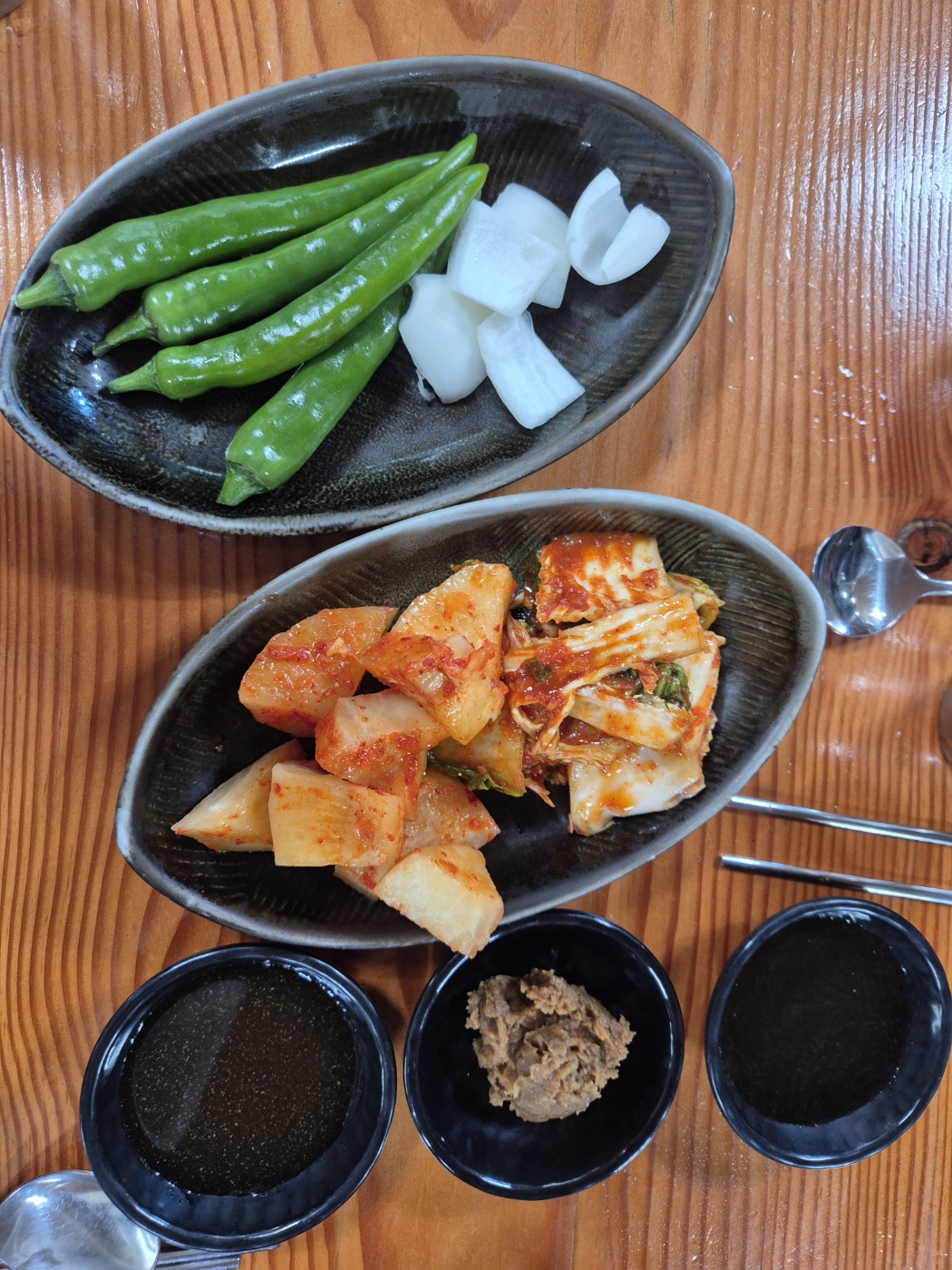 밑반찬은 김치, 깍뚜기, 고추, 양파에요.