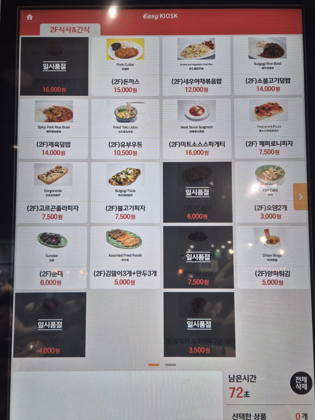 메뉴는 키오스크로 주문하면 되고, 밑반찬은 셀프로 가져다 먹어야했어요.