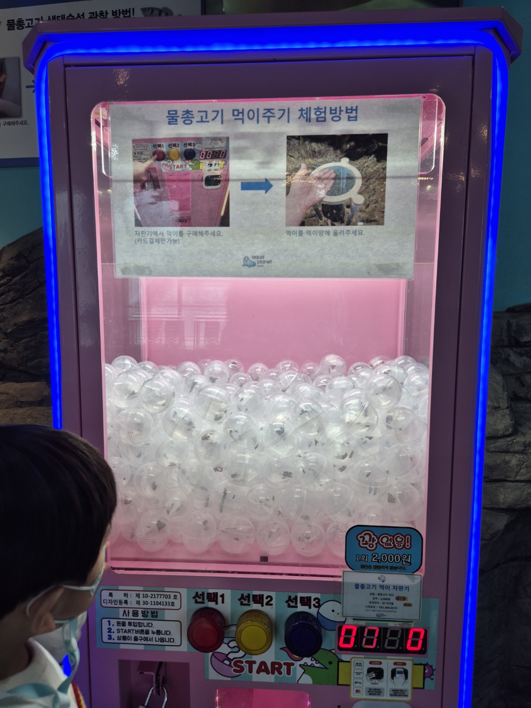 물총고기 먹이는 자판기로 운영이 되고 있었는데, 한 캡슐에 2,000원이면 구매할 수 있습니다.