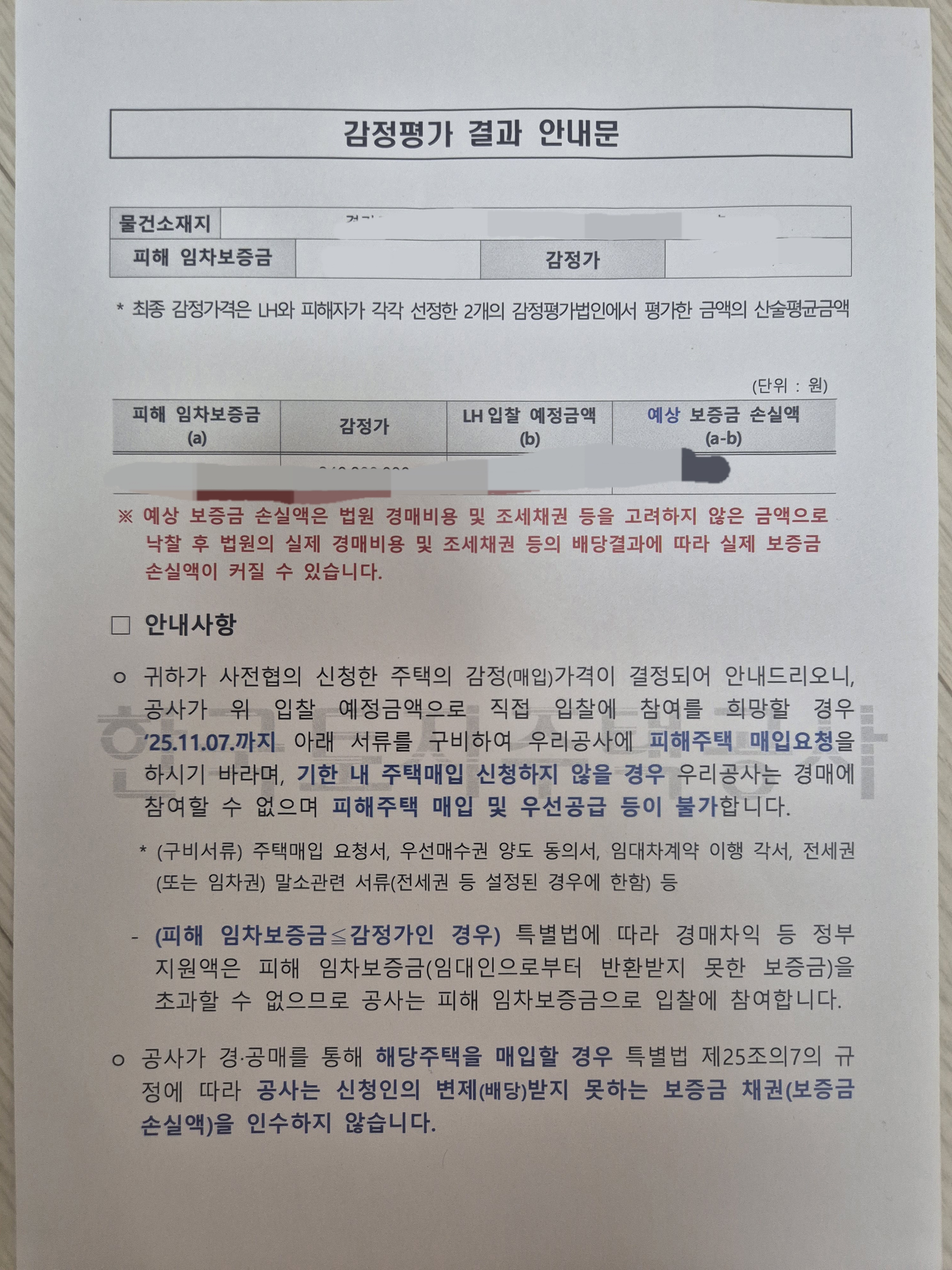 만약, 보증금보다 LH감정가가 낮게 나왔다면 보증금 차액에 대해서 지원을 받을 수 없기 때문에