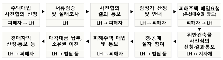 - 신청주택의 매입이 가능한 경우 특별법 시행령에 따라 감정평가기관을 선정, 의뢰 후 감정결과를 안내하고 신청자가 매입조건에 동의하여 매입 요청하는 경우 경공매에 참여합니다.